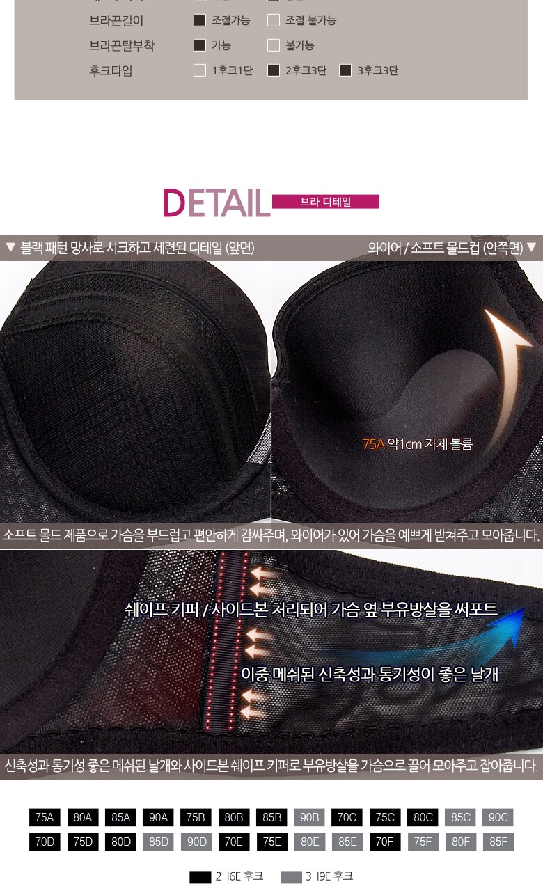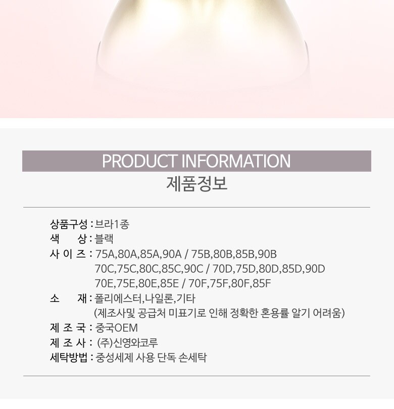 1. 제품 소재 (섬유의 조성 또는 혼용률을 백분율로 표시, 기능성인 경우 성적서 또는 허가서) | 브라-폴리에스터,나일론,기타(제조사미제공 혼용률 알수없음) |
