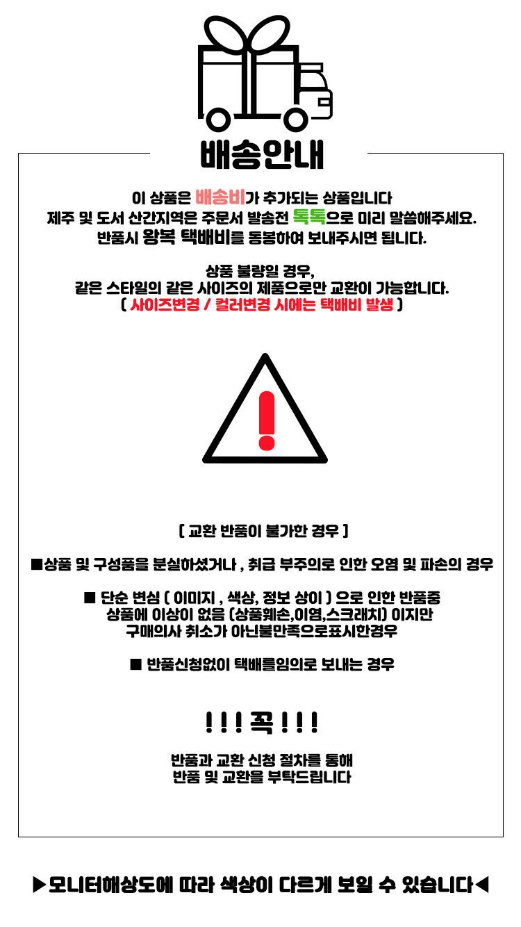 상품불량에 의한 반품, A/S, 품질보증 및 피해보상 등에 관한 사항은 소비자 분쟁해결기준(공정거래위원회 고시) 구매자가 미성년자인 경우에는 상품 구입시 법정대리인이 동의하지 아니하면 미성년자 본인 또는 법정대리인이 구매취소 할 수 있습니다. |