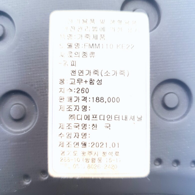 1. 제품 소재 (운동화인 경우에는 겉감, 안감을 구분하여 표시) 소가죽