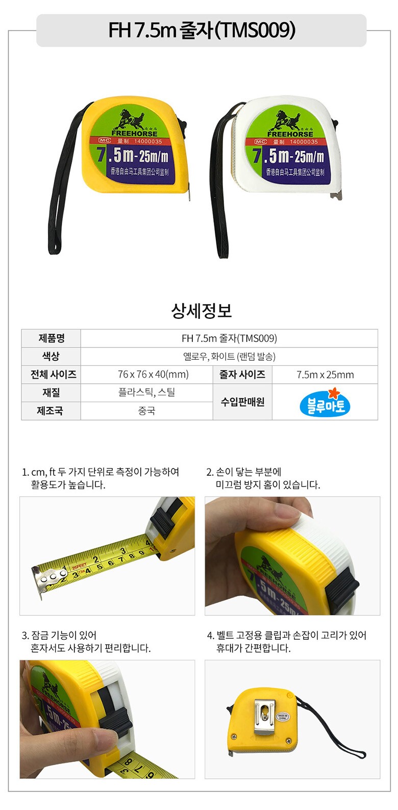 [블루마토] FH 7.5m 줄자(TMS009) (색상랜덤)