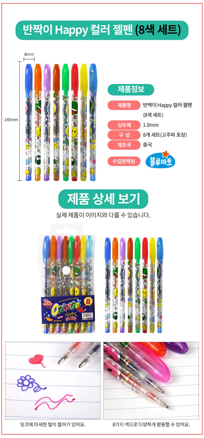 [블루마토] 반짝이 Happy 컬러젤 볼펜4 (Color Gell) 고주파포장(8색세트-8pcs)