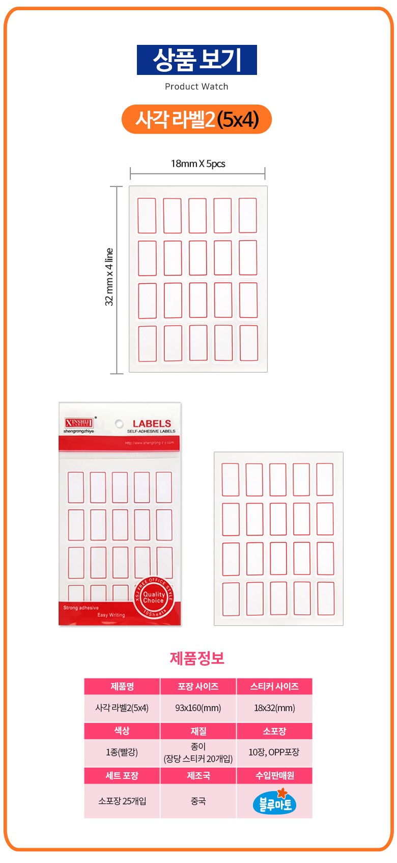 [블루마토] 사각라벨2(5*4), (1장-라벨20개)/(10P) -빨강(단품)