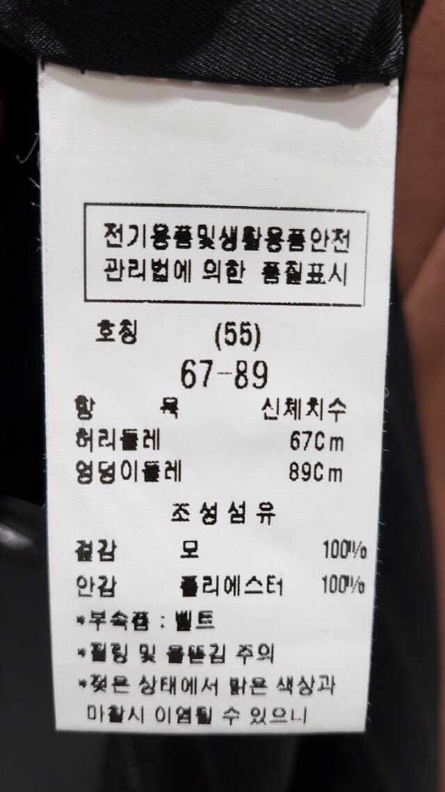 | 1. 제품 소재 (섬유의 조성 또는 혼용률을 백분율로 표시, 기능성인 경우 성적서 또는 허가서) | 모 100% / 안감:폴리에스테르 100% |