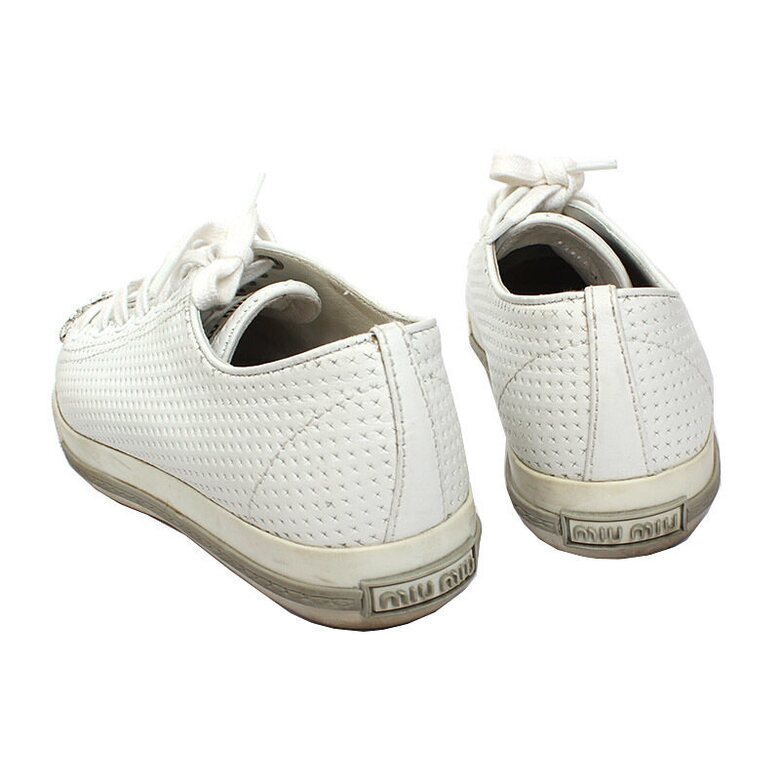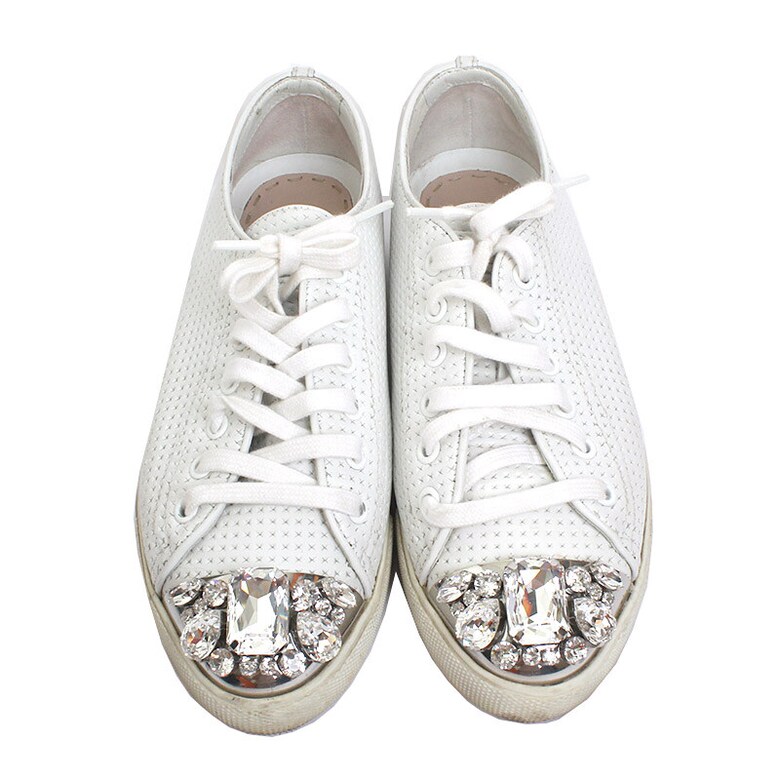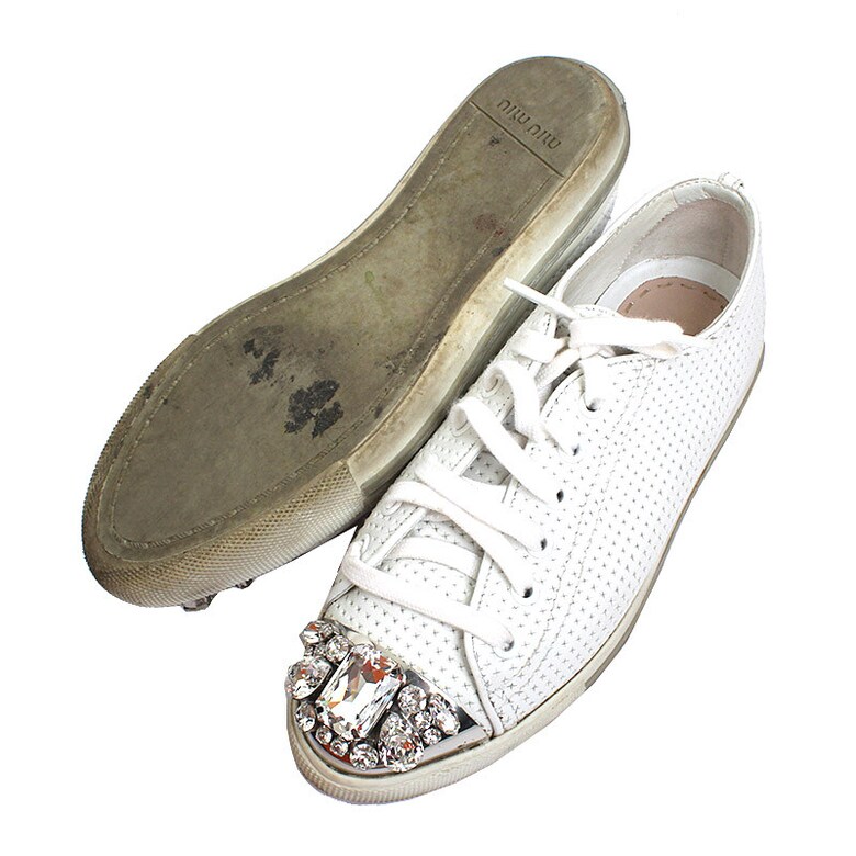 미우미우 화이트 크리스탈 스니커즈를 선보입니다.
