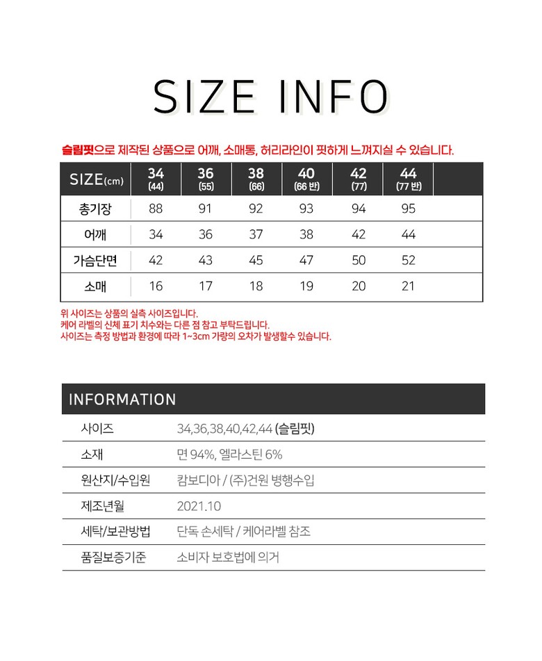 | 1. 제품 소재 (섬유의 조성 또는 혼용률을 백분율로 표시, 기능성인 경우 성적서 또는 허가서) | 면 94%, 엘라스틴 6% |