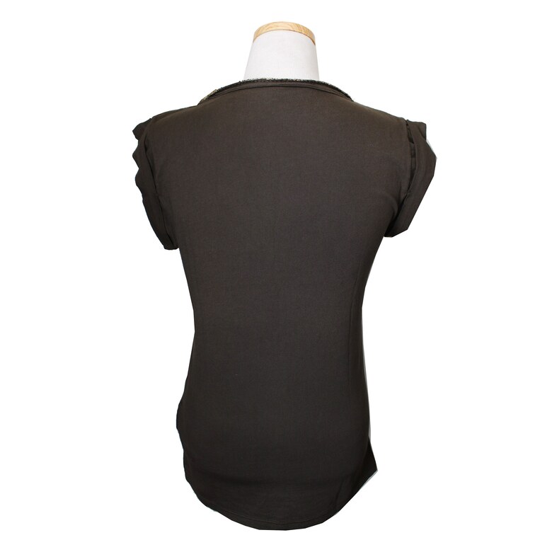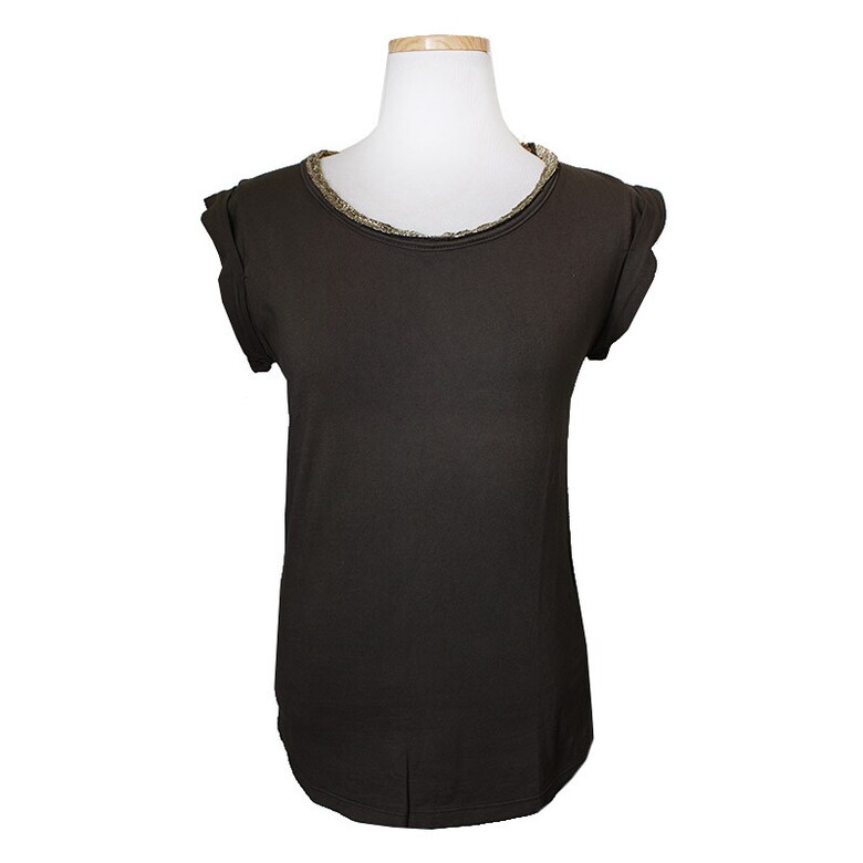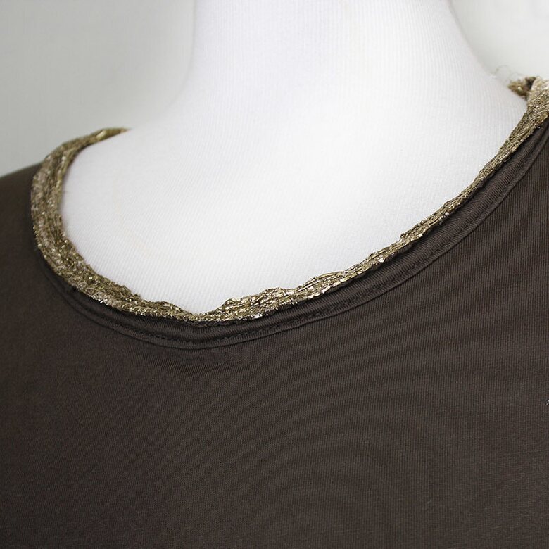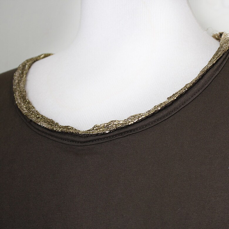 카키 바디에 골드 메탈릭사로 감싼 넥라인과 부담스럽지 않게 어깨를 살짝 가려주는