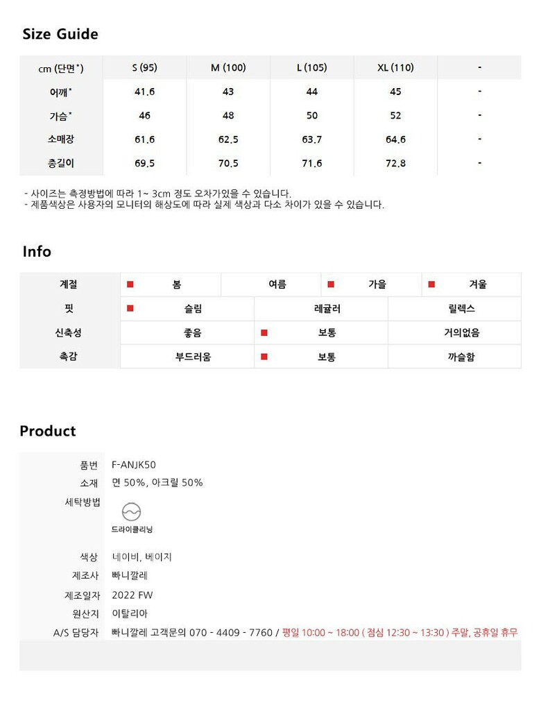 | 1. 제품 소재 (섬유의 조성 또는 혼용률을 백분율로 표시, 기능성인 경우 성적서 또는 허가서) | 상품상세참조 |