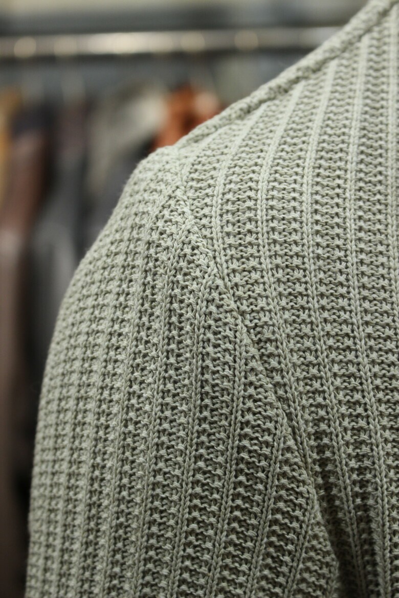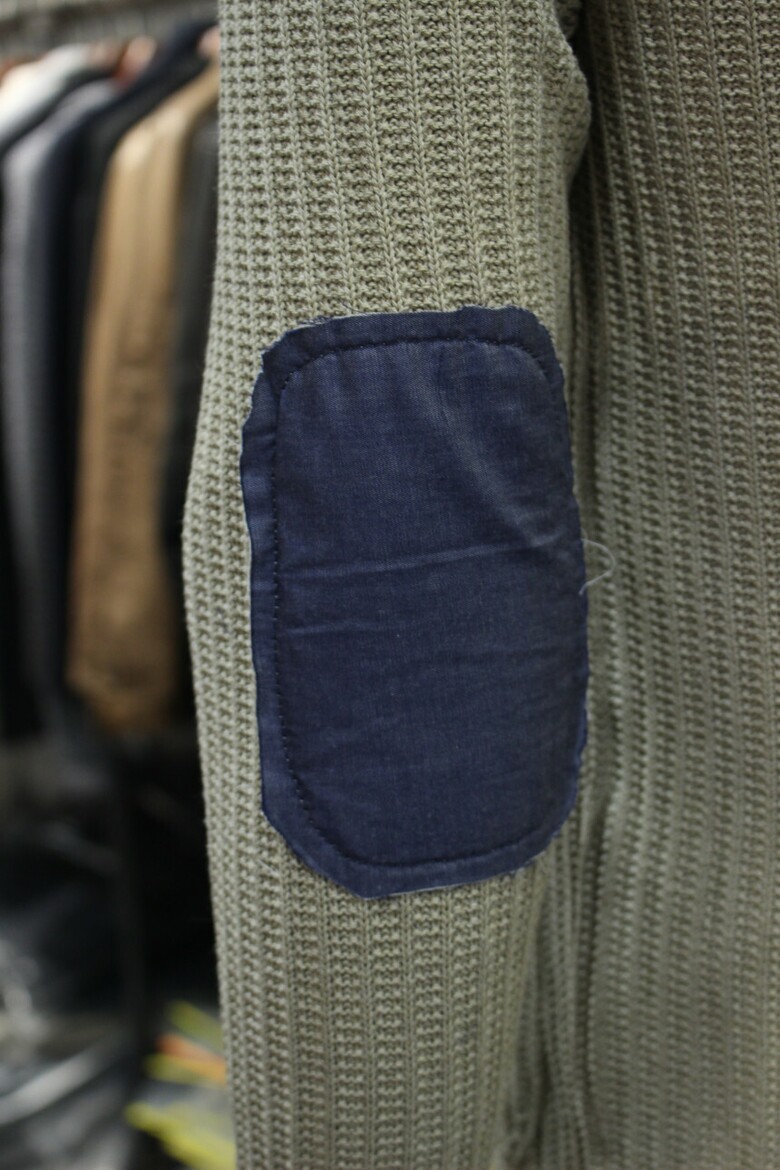 신축성좋은 골지니트조직에 빈티지한패치를 더해