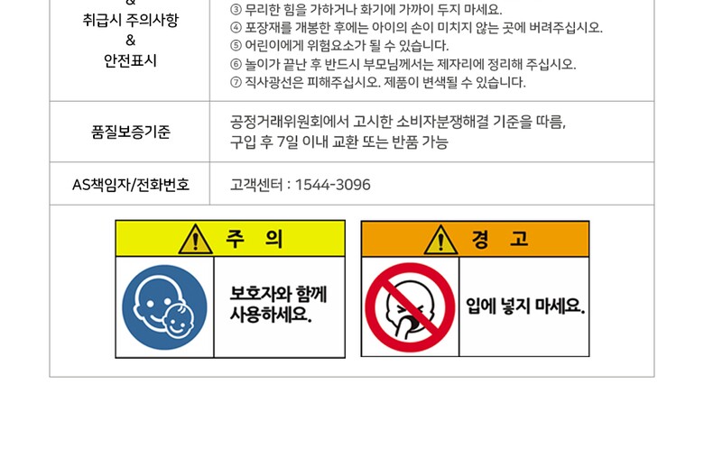10. 취급방법 및 취급시 주의사항, 안전표시 (주의, 경고 등) | 마른 헝겊이나 물기를 꽉 짠 수건으로 살살 닦아 주시고 통풍이 잘되는 곳에 보관하여 주세요.절대로 올라 타거나 밟지 마십시오.사람이나 물건을 향해 본체나 부속품을 던지면 위험합니다.무리한 힘을 가하거나 화기에 가까이 두지 마세요. 포장재를 개봉한 후에는 아이의 손이 미치지 않는 곳에 버려주십시오. 어린이에게 위험요소가 될 수 있습니다.놀이가 끝난 후 반드시 부모님께서는 제자리에 정리해 주십시오.직사광선은 피해주십시오. 제품이 변색될 수 있습니다. |