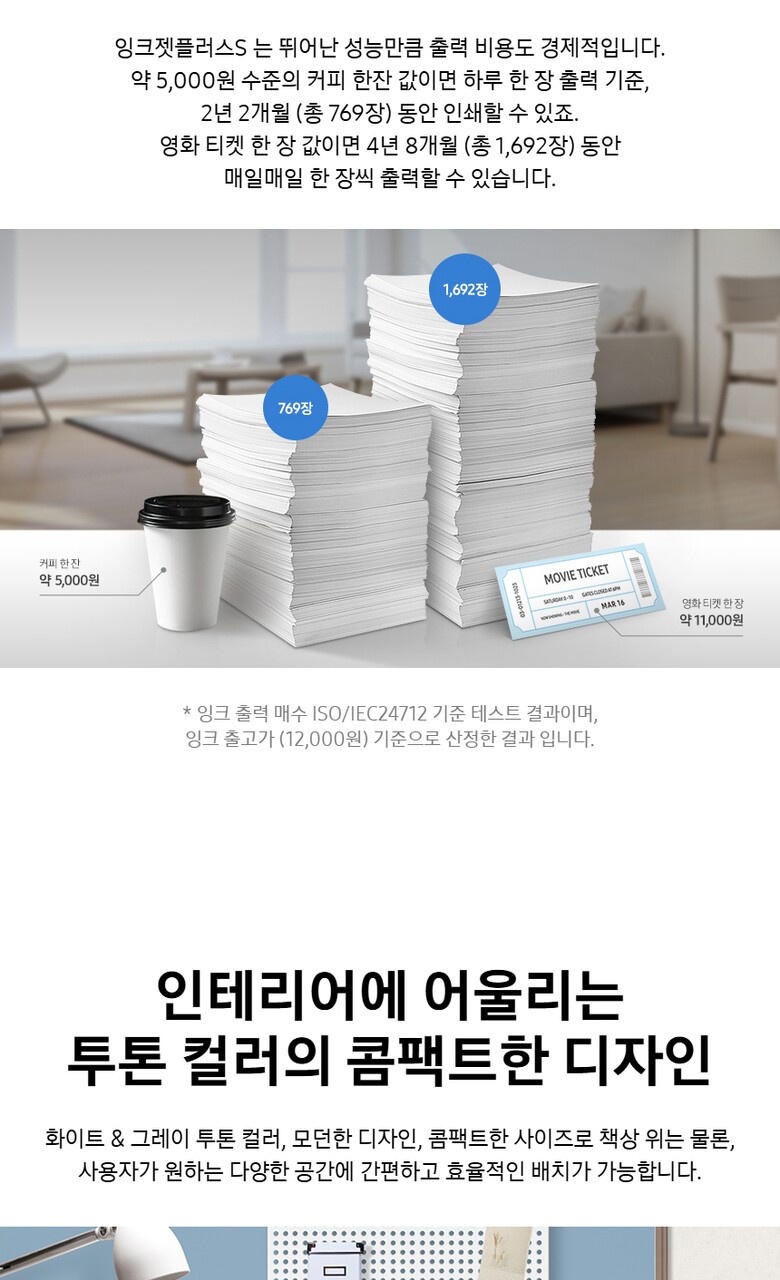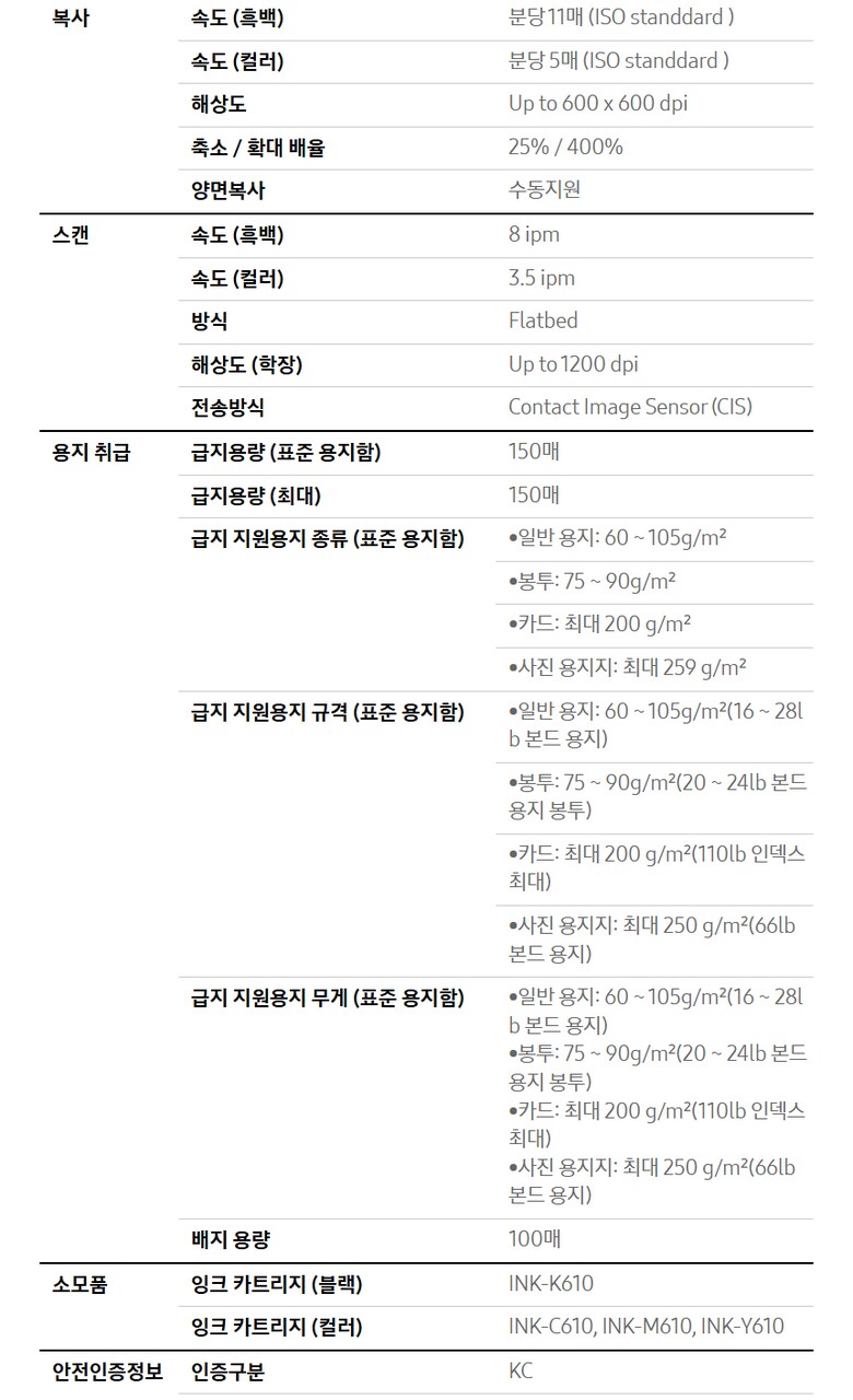- 복합기 / 잉크젯 / 컬러 출력 / 복사 / 스캔 / 컬러 속도 : 21ppm / 흑백 속도 : 22ppm / 첫 장 인쇄 : 15초 (컬러 18초) / 인쇄 해상도 : 4800 x 1200dpi / 자동양면인쇄 / 용지함 용