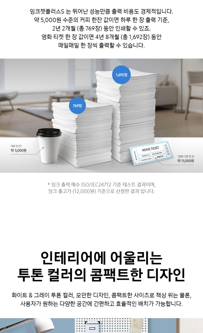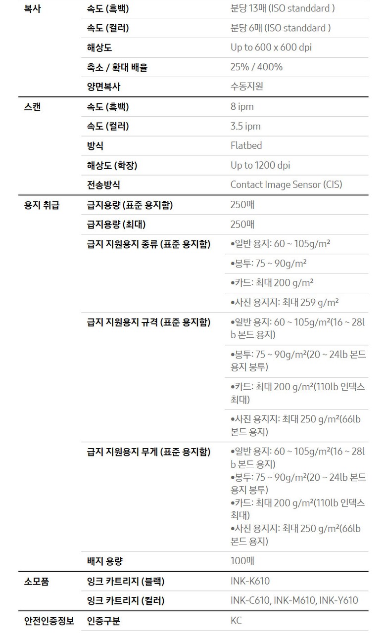 - 복합기 / 잉크젯 / 컬러 출력 / 복사 / 스캔 / 컬러 속도 : 22ppm / 흑백 속도 : 23ppm / 첫 장 인쇄 : 14초 (컬러 16초) / 인쇄 해상도 : 4800 x 1200dpi / 자동양면인쇄 / 용지함 용