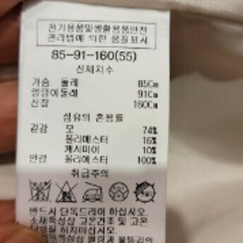 | 1. 제품 소재 (섬유의 조성 또는 혼용률을 백분율로 표시, 기능성인 경우 성적서 또는 허가서) | 겉감 : 모75%,캐시미어10%,폴리에스터15% 안감 : 폴리에스터100% |