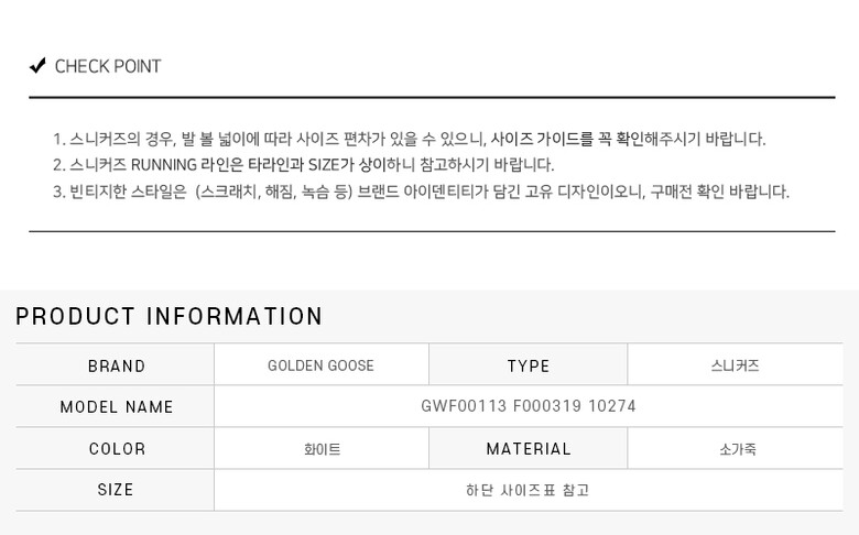 | 1. 제품 소재 (운동화인 경우에는 겉감, 안감을 구분하여 표시) | 상세페이지 참조 |