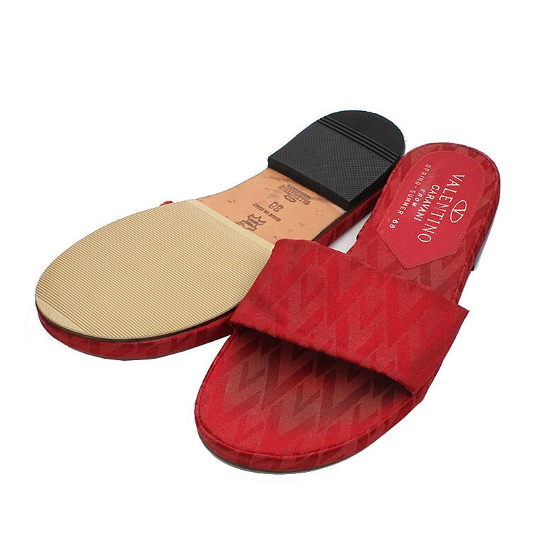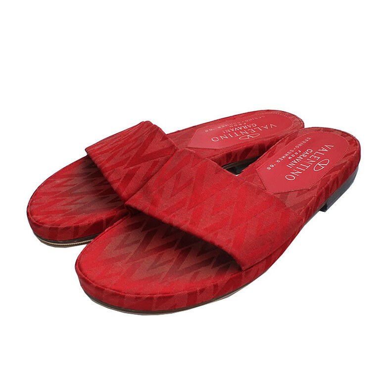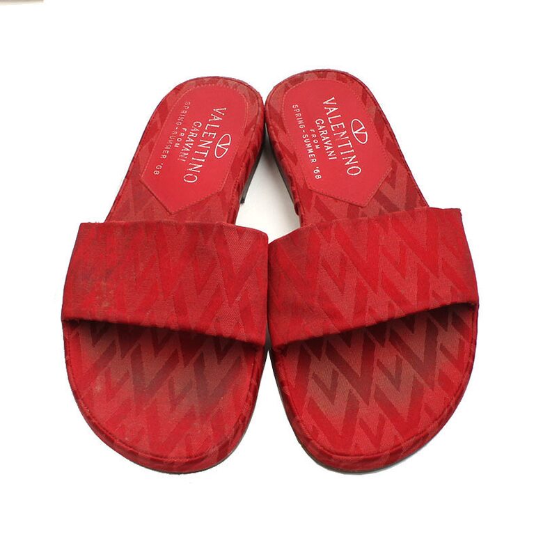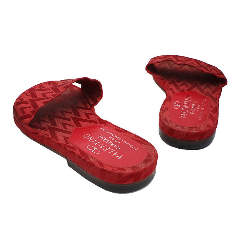 발렌티노 레드 패브릭 슬리퍼를 선보입니다.