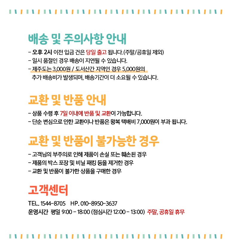 상품불량에 의한 반품, A/S, 품질보증 및 피해보상 등에 관한 사항은 소비자 분쟁해결기준(공정거래위원회 고시) 구매자가 미성년자인 경우에는 상품 구입시 법정대리인이 동의하지 아니하면 미성년자 본인 또는 법정대리인이 구매취소 할 수 있습니다. |