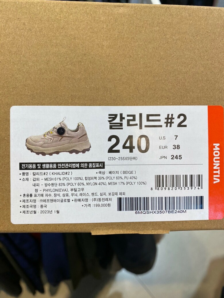 | 1. 제품 소재 (운동화인 경우에는 겉감, 안감을 구분하여 표시) | 갑피 - 메쉬,합성피혁 내피 - 나일론,폴리에스터 창 - 파일론,부틸고 |