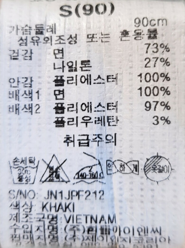 | 1. 제품 소재 (섬유의 조성 또는 혼용률을 백분율로 표시, 기능성인 경우 성적서 또는 허가서) | 겉감:면 73%, 나일론 27% / 안감:폴리에스테르 100% / 배색1:면 100% |