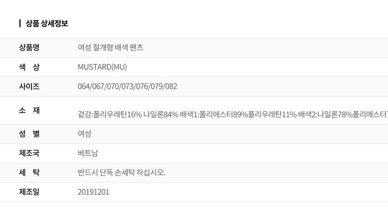 | 1. 제품 소재 (섬유의 조성 또는 혼용률을 백분율로 표시, 기능성인 경우 성적서 또는 허가서) | 겉감:폴리우레탄16% 나일론84% 배색1:폴리에스터89%폴리우레탄11% 배색2:나일론78%폴리에스터7%폴리우레탄15% |