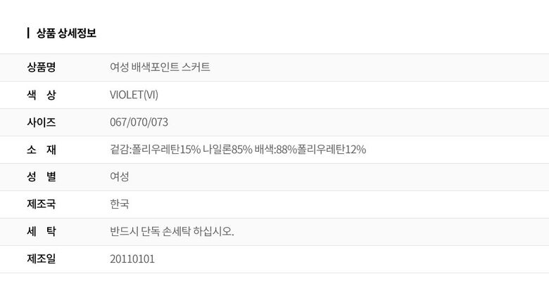 1. 제품 소재 (섬유의 조성 또는 혼용률을 백분율로 표시, 기능성인 경우 성적서 또는 허가서) 겉감:폴리우레탄15% 나일론85% 배색:88%폴리우레탄12%