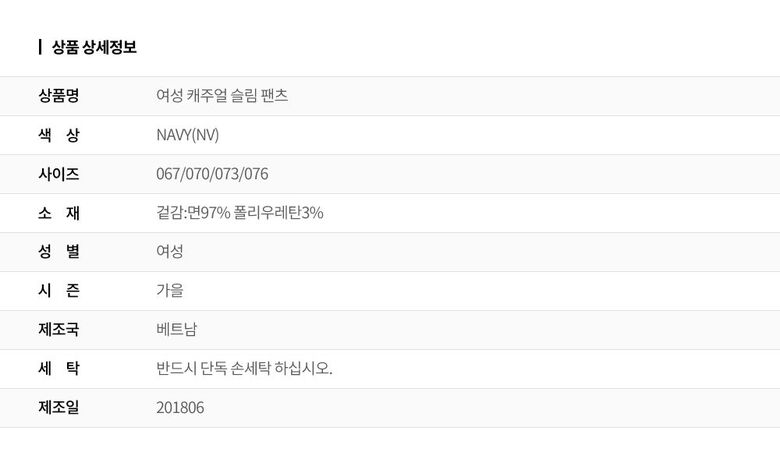 | 1. 제품 소재 (섬유의 조성 또는 혼용률을 백분율로 표시, 기능성인 경우 성적서 또는 허가서) | 겉감:면97% 폴리우레탄3% |