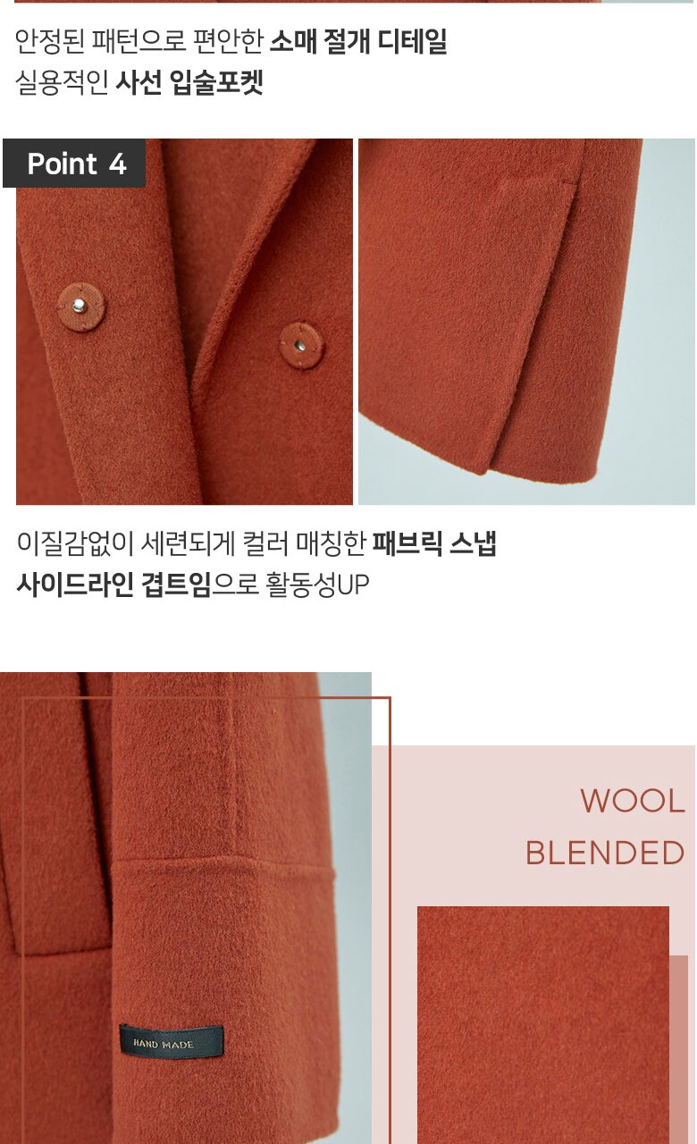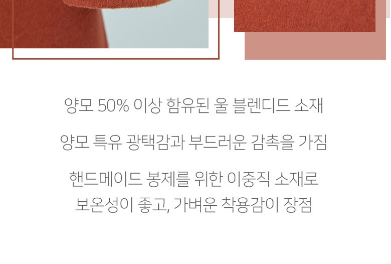 1. 제품 소재 (섬유의 조성 또는 혼용률을 백분율로 표시, 기능성인 경우 성적서 또는 허가서) | [라이트베이지] 모 53%, 폴리에스터 27%, 아크릴 16%, 기타 4% [브릭브라운] 모 51%, 폴리에스터 43%, 나일론 5%, 아크릴 1% [블루] 모 51%, 폴리에스터 46%, 나일론 2%, 아크릴 1% [다크네이비] 모 52%, 폴리에스터 44%, 나일론 1%, 아크릴 3% |