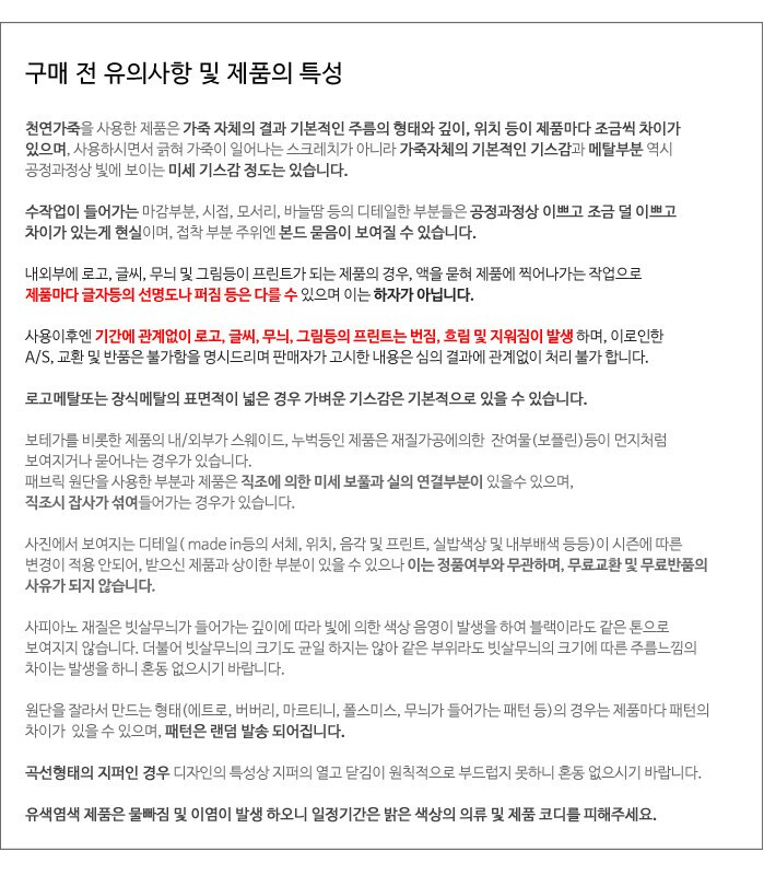 | 세탁 및 취급방법 | 세탁불가(부드럽고 마른천으로 먼지만 관리) 사용 및 보관시 고온, 습기(빗물, 체습 등), 직사광 및 마찰등으로 변형, 변색이 될수 있으니 주의바라며 물기를 접했을땐 부드럽고 마른천으로 톡톡두드려 흡수 후 서늘한 그늘에 말려주세요 |