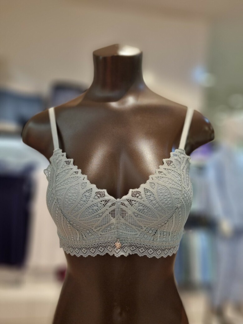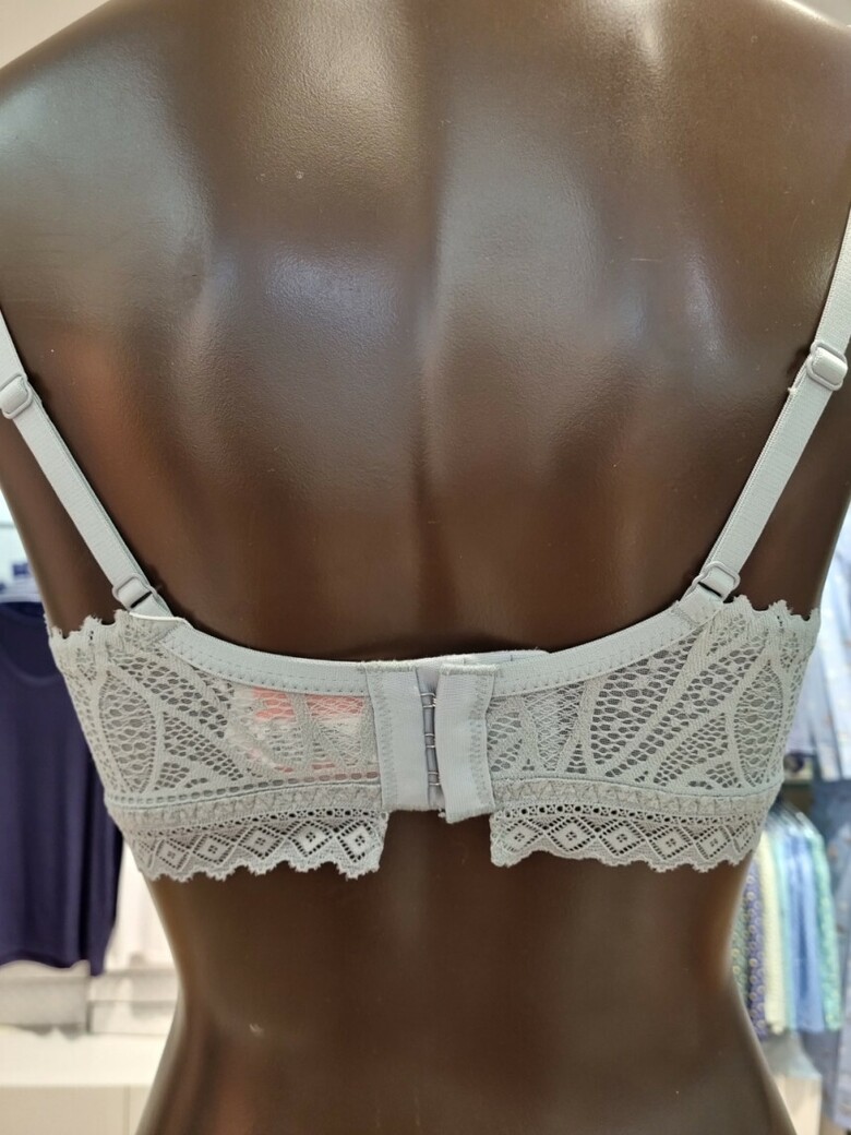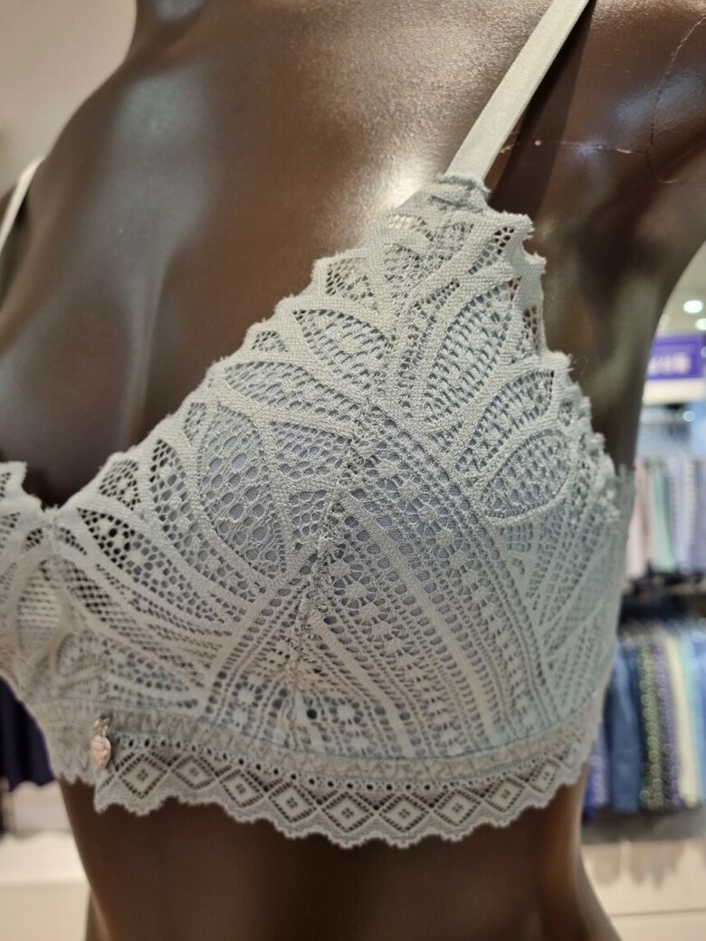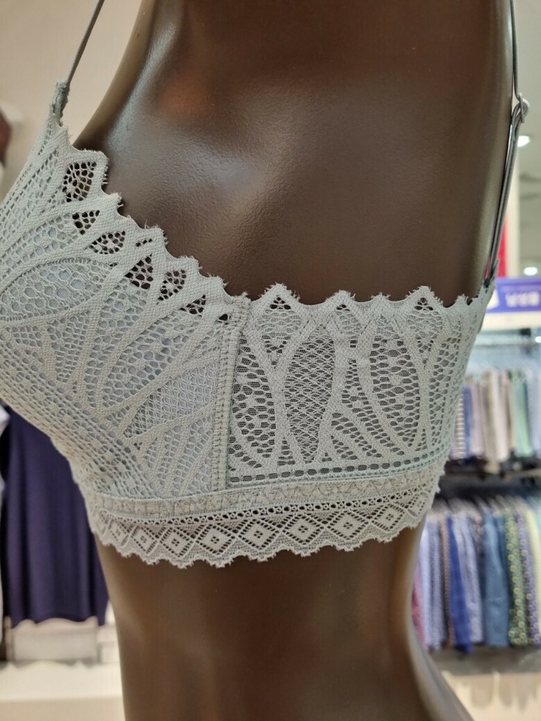 3/4의 몰드컵위로 중심을 기준으로 전체적으로 레이스가 올가있는 디자인의 노와이어브라렛입니다.