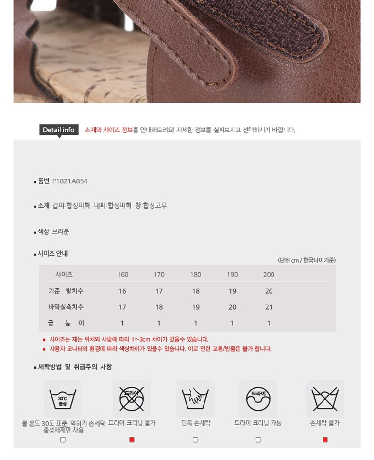 1. 제품 소재 (섬유의 조성 또는 혼용률을 백분율로 표시, 기능성인 경우 성적서 또는 허가서) | 갑피:합성피혁 내피:합성피혁 창:합성고무 |