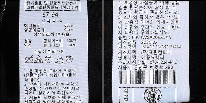 | 1. 제품 소재 (섬유의 조성 또는 혼용률을 백분율로 표시, 기능성인 경우 성적서 또는 허가서) | 겉감:폴리에스터100% 안감:폴리에스터100% |