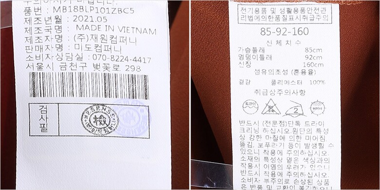 1. 제품 소재 (섬유의 조성 또는 혼용률을 백분율로 표시, 기능성인 경우 성적서 또는 허가서) 겉감:폴리에스터100%
