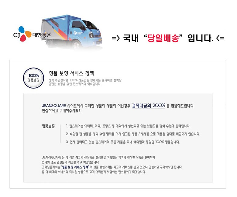 - 저희 진스퀘어(Jeansquare)는 정직한 상품을 고객여러분께 판매하고 있으며 정품이 아닌상품일시 결제대금의 2배의 배상을 책임지고 있음을 약속드립니다.