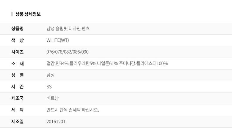 | 1. 제품 소재 (섬유의 조성 또는 혼용률을 백분율로 표시, 기능성인 경우 성적서 또는 허가서) | 겉감:면34% 폴리우레탄5% 나일론61% 주머니감:폴리에스터100% |