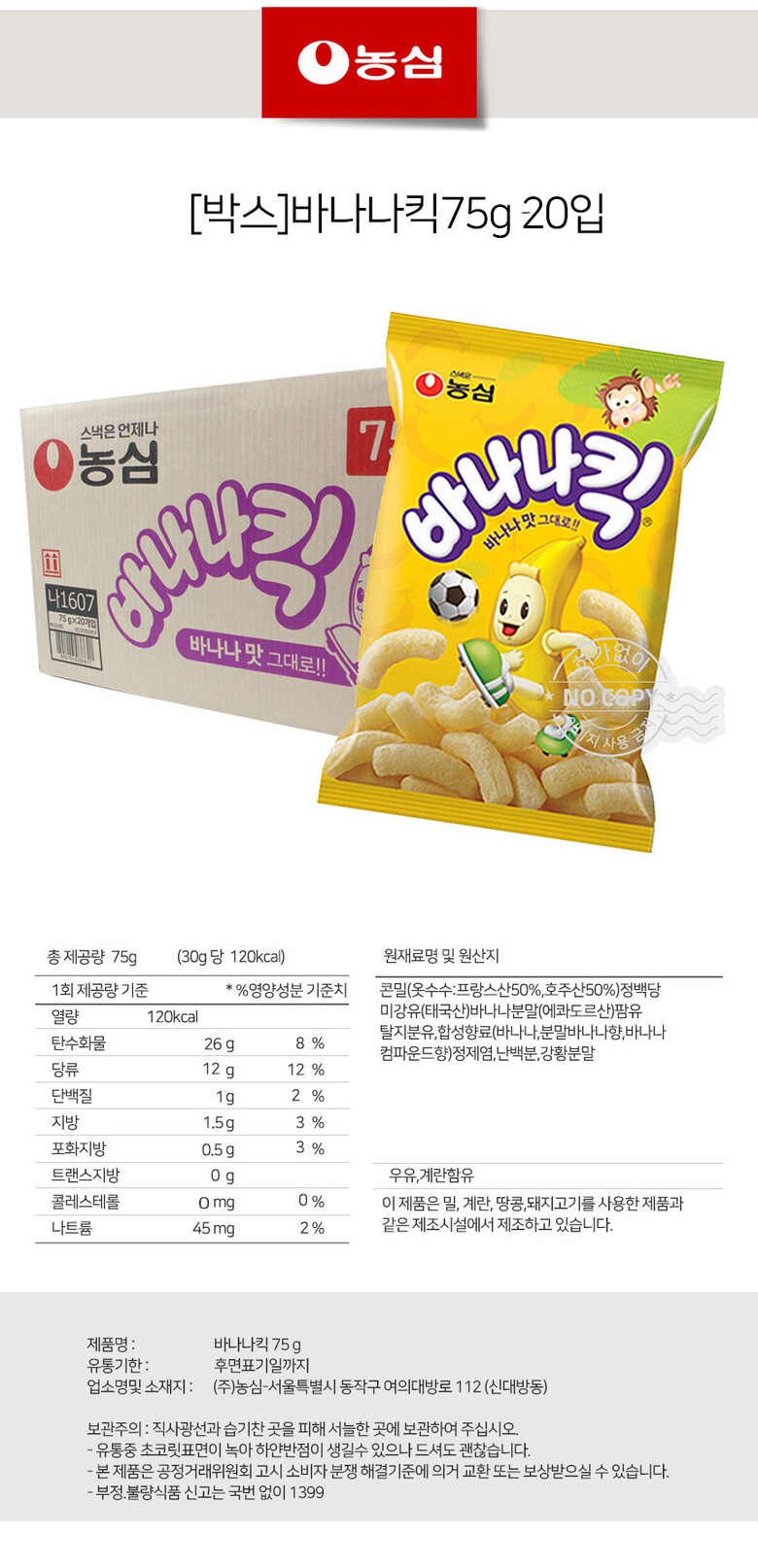 해당 상품은 [ [박스] 농심 바나나킥 75g 20입 ] 구성의 상품입니다.