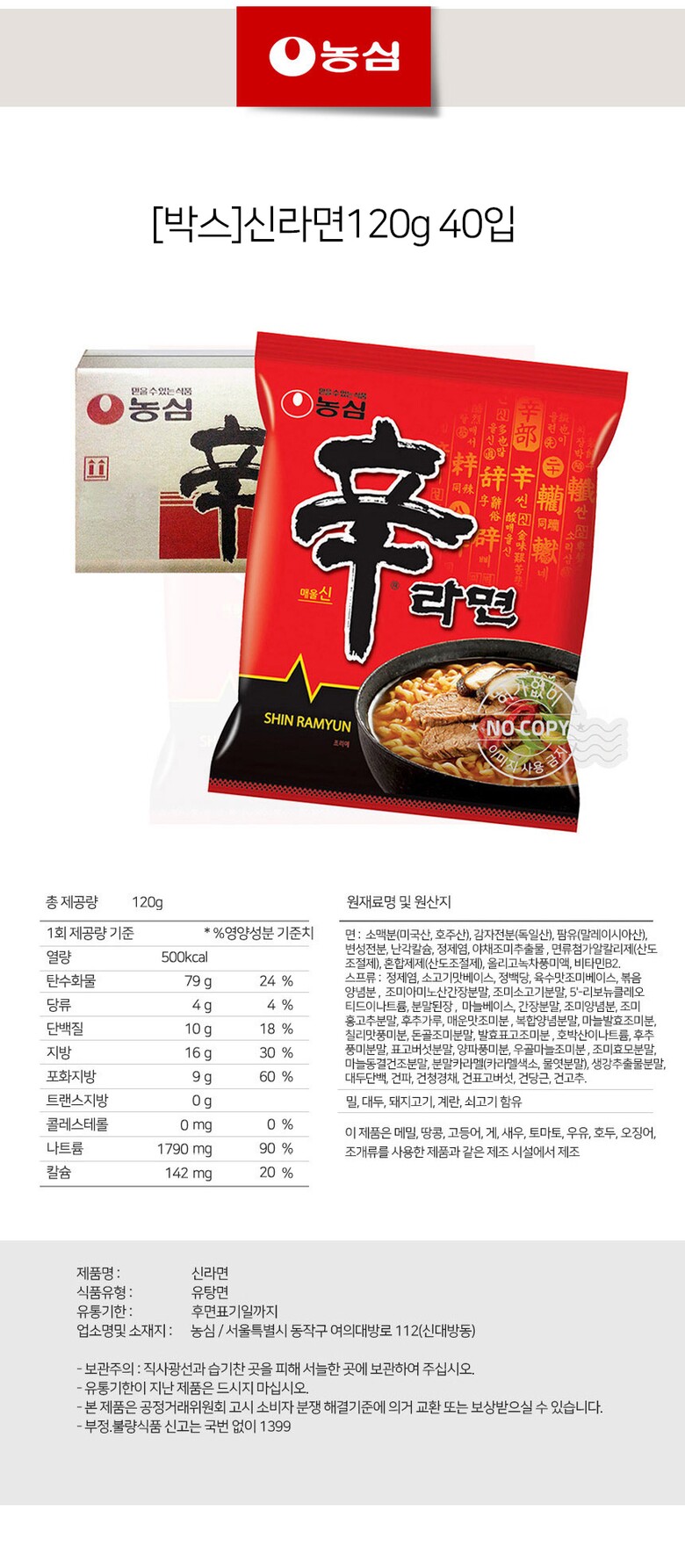 해당 상품은 [ [박스] 농심 신라면 120g 40입 ] 구성의 상품입니다.