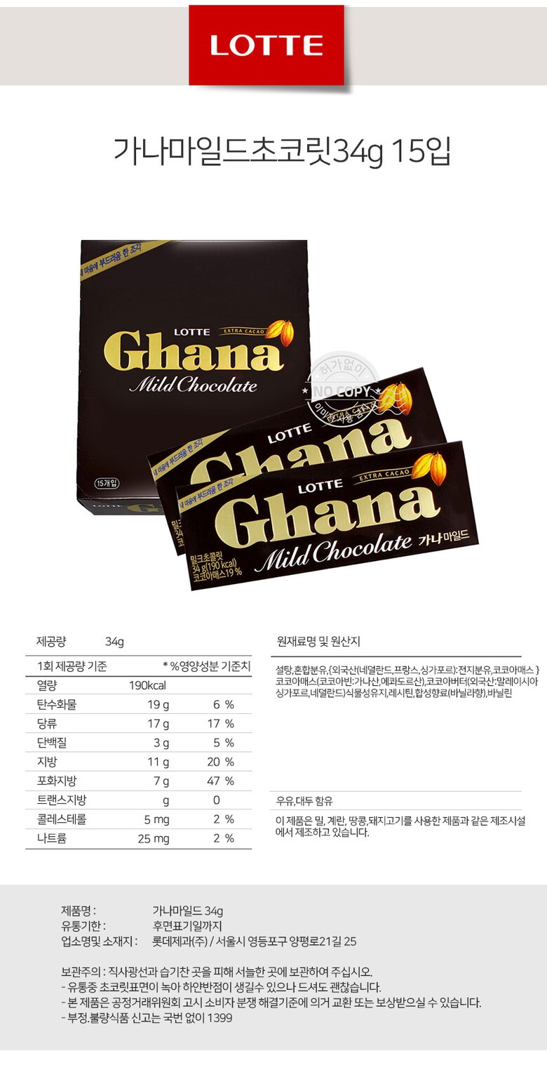 해당 상품은 [ 롯데 가나 마일드초콜릿 34g 15입 ] 구성의 상품입니다.