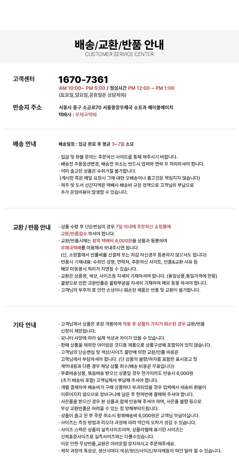 • 처음 배송된 상품상태와 다를 경우(세탁/착용 후 외출하신 경우) 반품이 불가합니다.