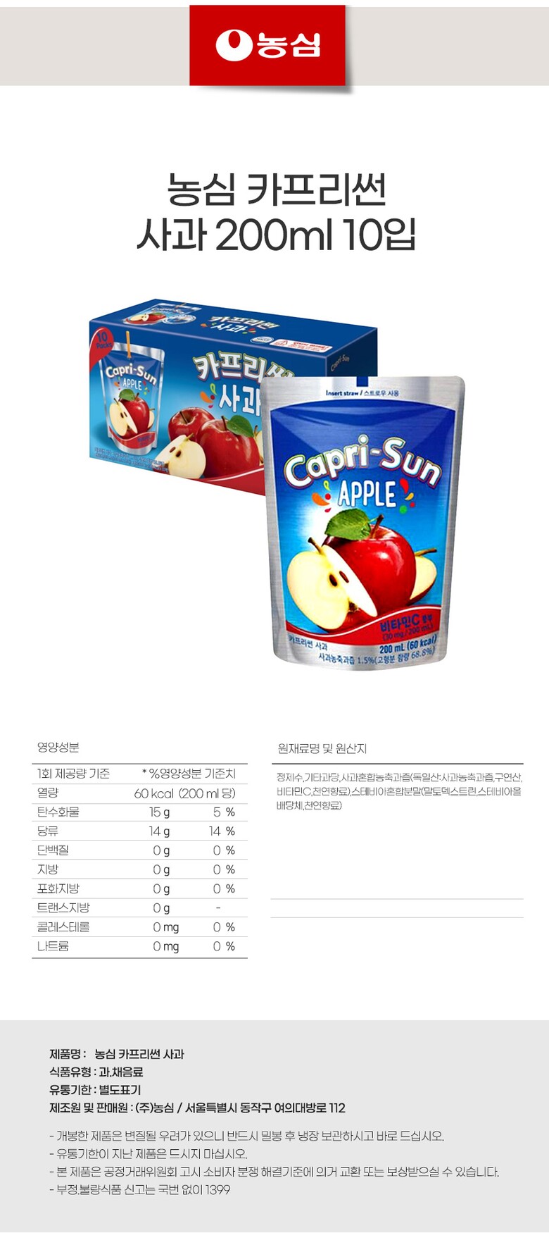 해당 상품은 [농심 카프리썬 사과 200ml 10입 (2000ml) ] 구성의 상품입니다.
