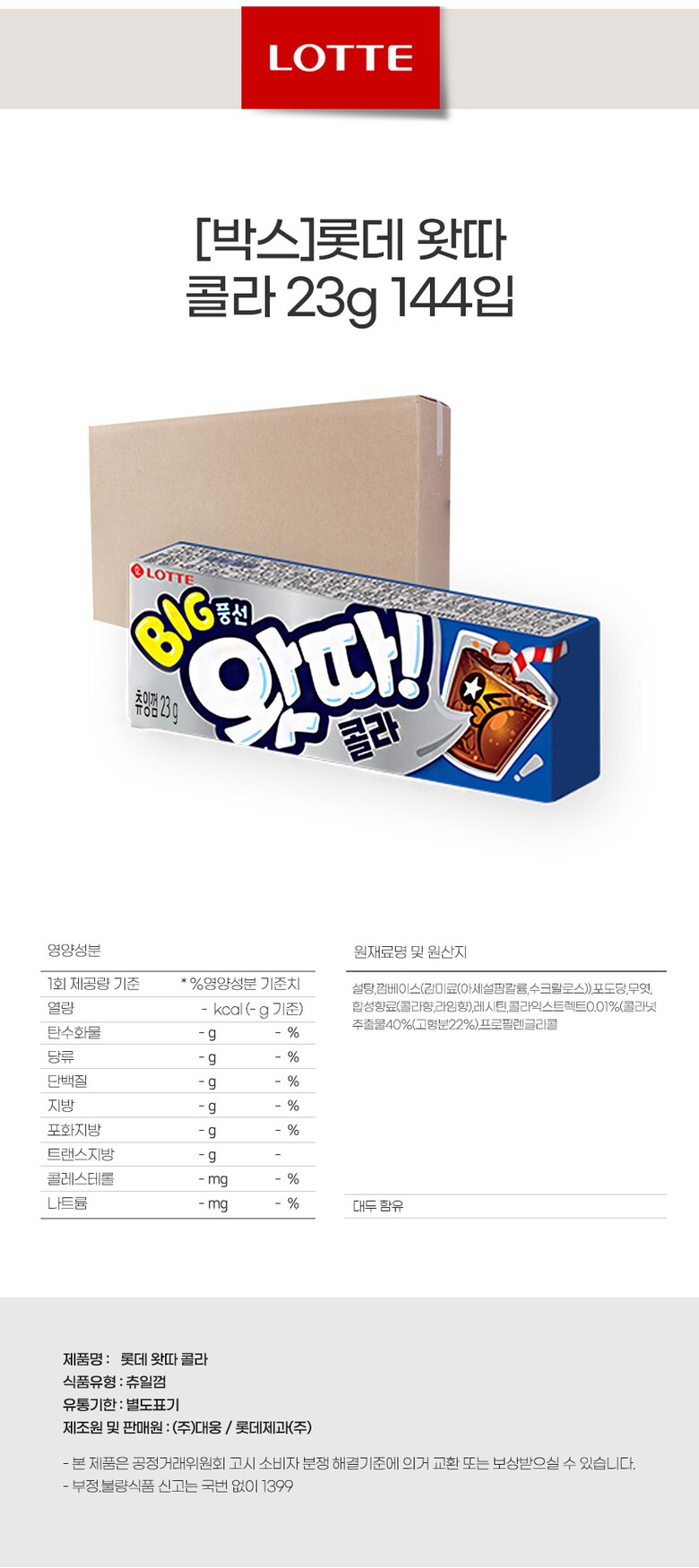 1. 포장단위별 용량(중량),수량,크기 | [박스]롯데 왓따 콜라 23g 144입 (3312g) |