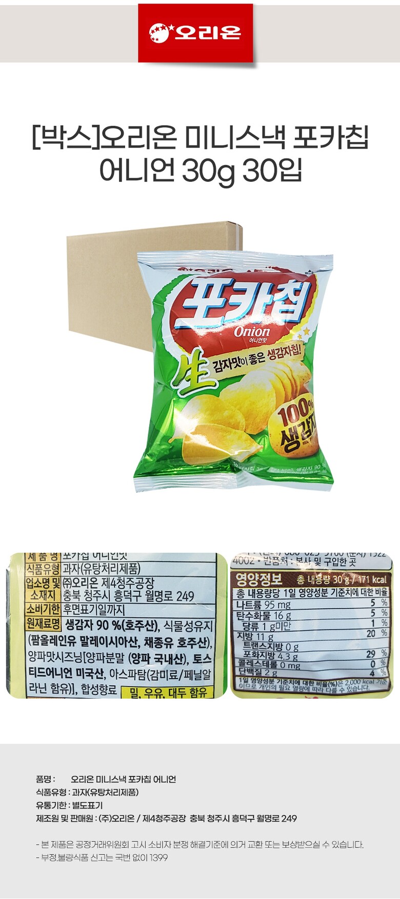 해당 상품은 [[박스]오리온 미니스낵 포카칩 어니언 30g 30입 (900g) ] 구성의 상품입니다.