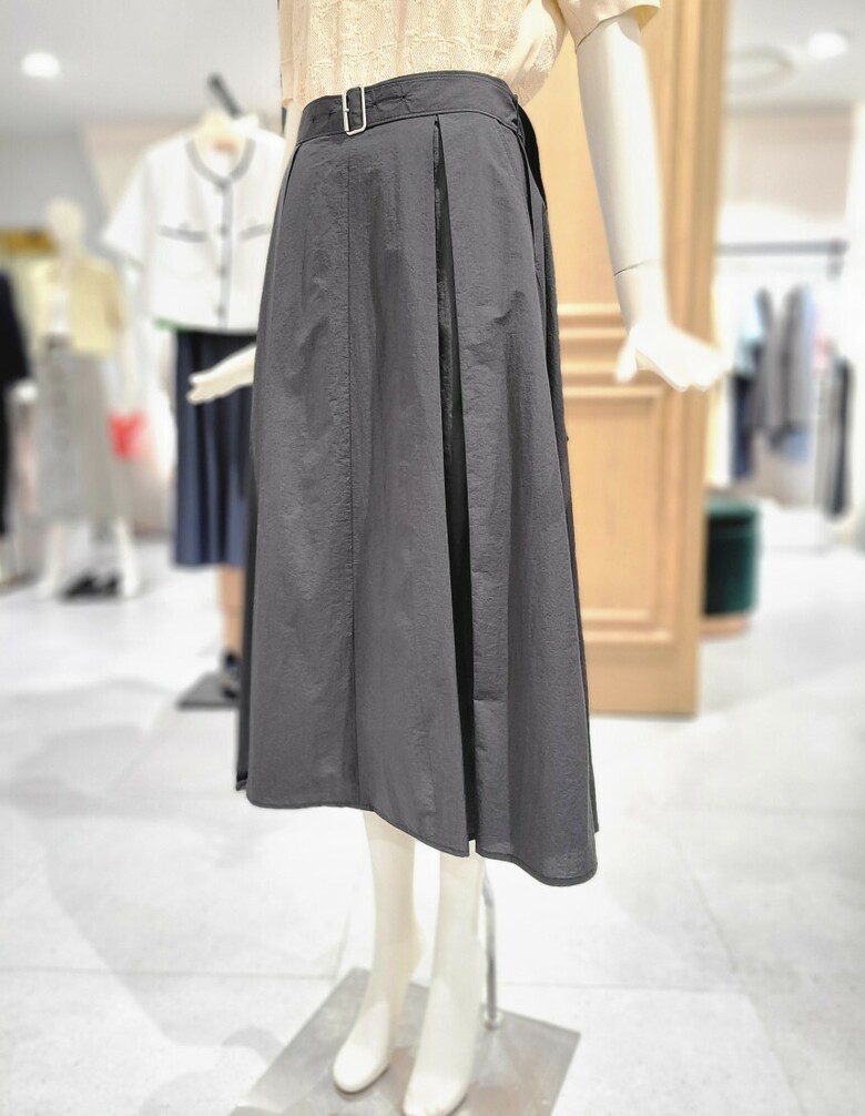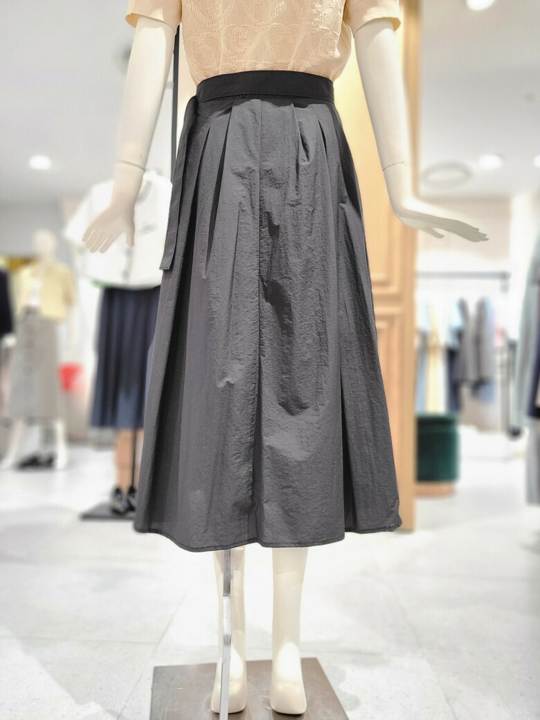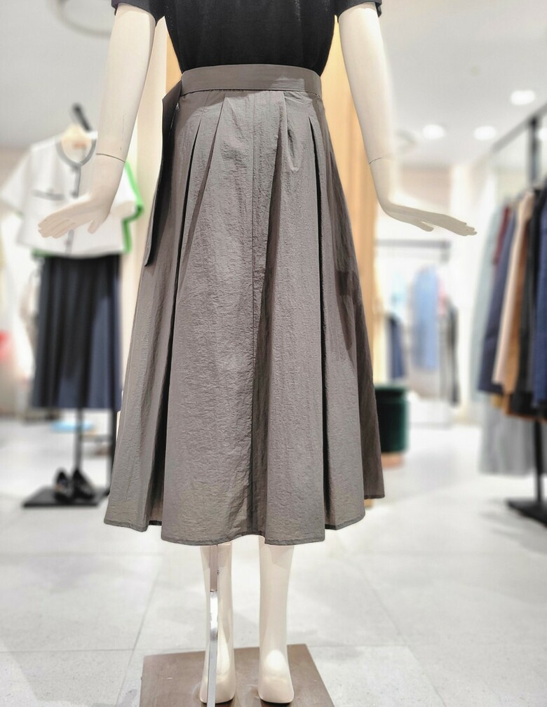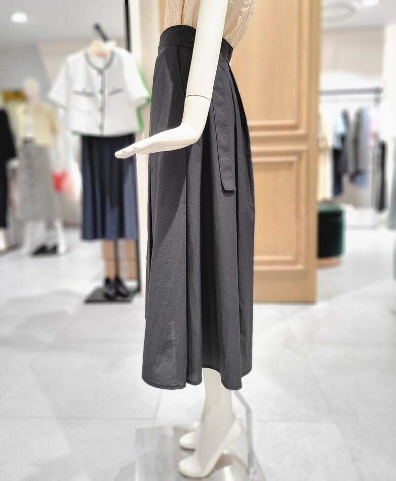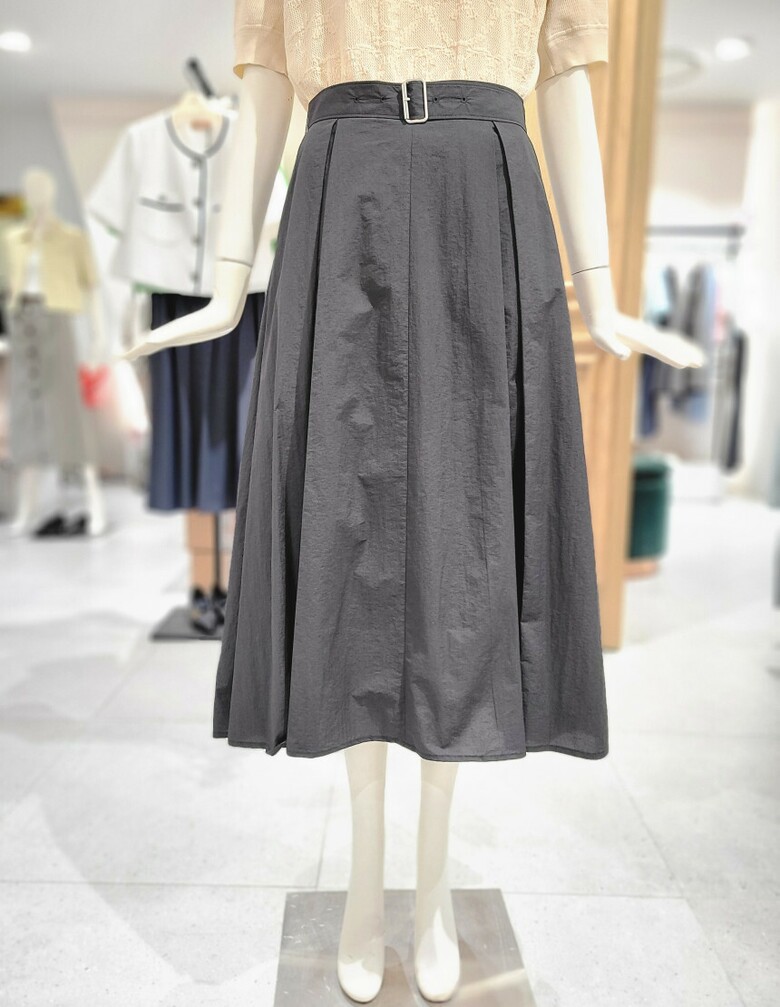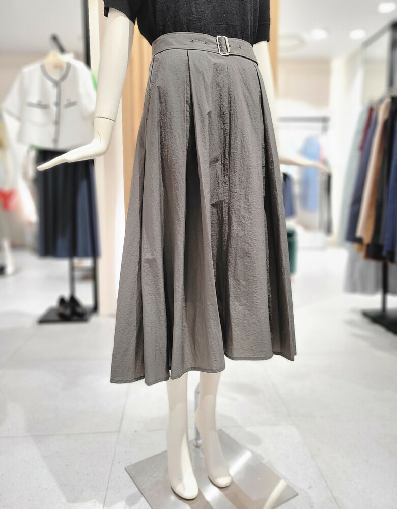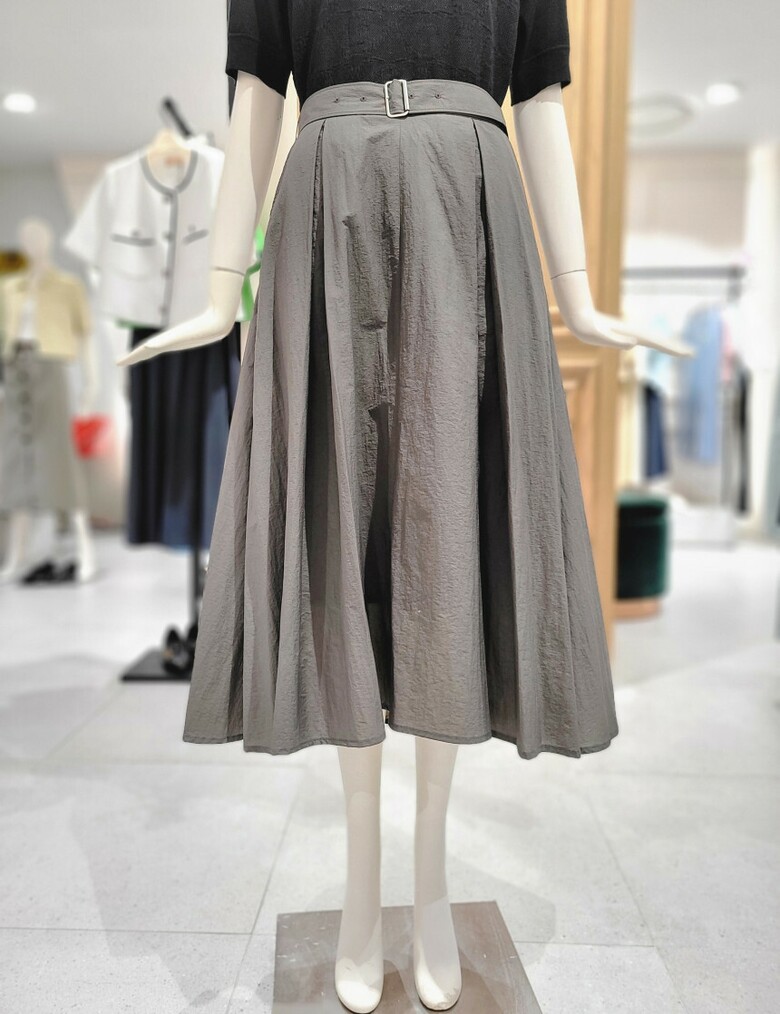 핀턱 백 밴딩 벨트 플레어 롱 스커트