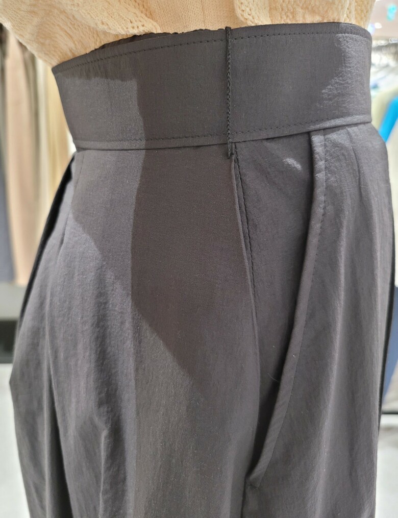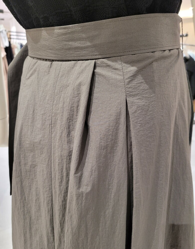 사그락 거리는 원단에 핀턱 디테일과 벨트포인트로 허리선을 잡고