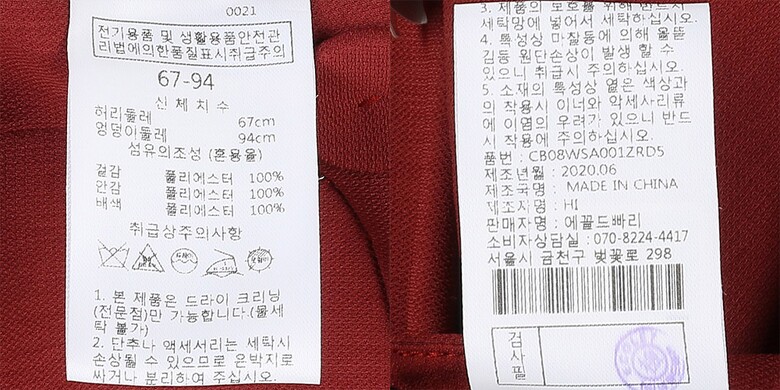 | 1. 제품 소재 (섬유의 조성 또는 혼용률을 백분율로 표시, 기능성인 경우 성적서 또는 허가서) | 겉감:폴리에스터100% 안감:폴리에스터100% 배색:폴리에스터100% |