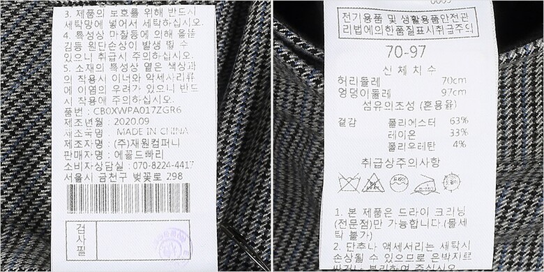 | 6. 세탁방법 및 취급시 주의사항 | 상세페이지 참조 |