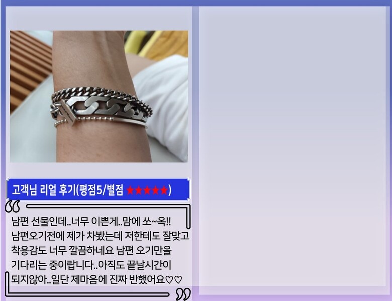 -물기는 최대한 멀리해주시고 물기가 묻으면 바로 닦아주시면 새상품처럼 오래도록 착용이 가능합니다.  |
