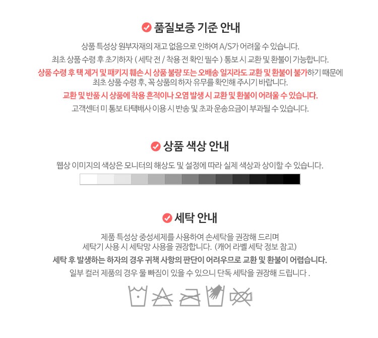• 처음 배송된 상품상태와 다를 경우(세탁/착용 후 외출하신 경우) 반품이 불가합니다.