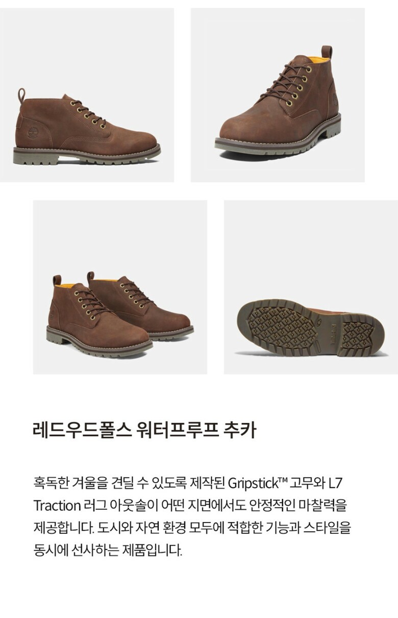 남성 레드우드 폴스 추카 부츠는 쿠션감 있는 내부, 신기 편한 발목 높이, 편리한 착화를 도와주는 백탭이 특징입니다. 또한 솔기가 밀봉 처리되어 있고 방수 프리미엄 팀버랜드® 가죽 소재로 제작되었으며, 팀버랜드의 특허받은 L7 다방향 러그 디자인이 우수한 내마모성, 접지력 및 배수성을 유지합니다. 또한 안감은 재생 PET 플라스틱을 50% 이상 함유한 ReBOTL™ 패브릭으로 제작되었습니다. ? 방수 프리미엄 팀버랜드® 가죽 소재 어퍼 ? 레이스업 스타일 ? ReBOTL™ 패브릭 안감 ? OrthoLite® 풋베드 ? EVA 미드솔 ? 아치 지지용 스틸 섕크 ? TPR 웰트 ? Gripstick™ 고무 아웃솔 ? 다방향 리딩 엣지와 비스듬한 러그 사이드월이 특징인 팀버랜드의 특허받은 L7 러그 디자인 ? 솔기 밀봉 구조