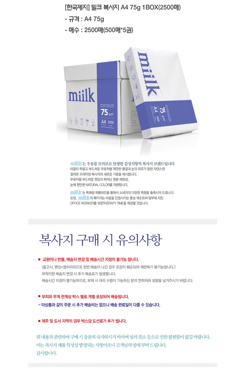 [한국제지] 밀크 복사지 A4 75g 1BOX(2500매)