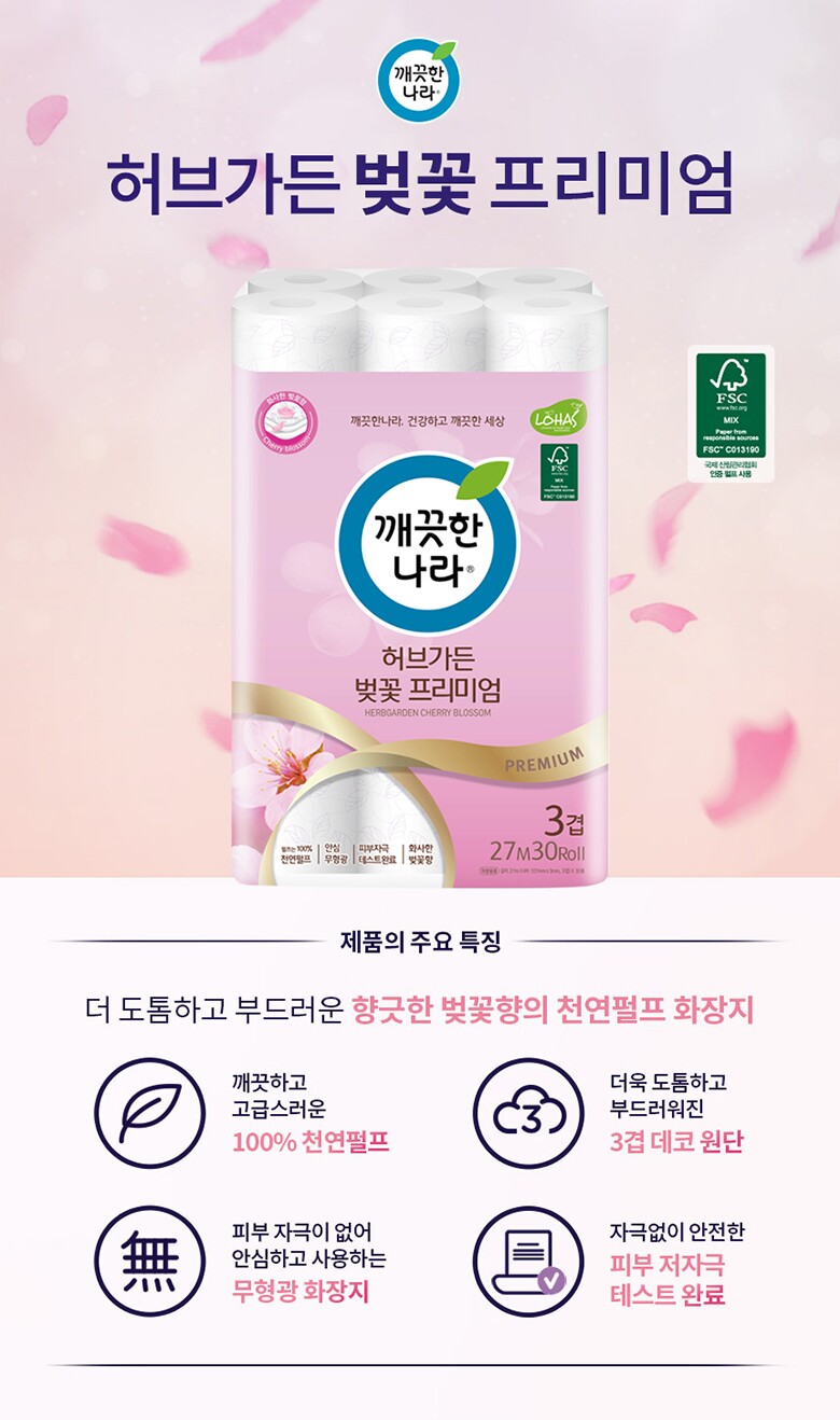 [깨끗한나라] 화장지 데코 3겹 벚꽃 (27Mx30롤)