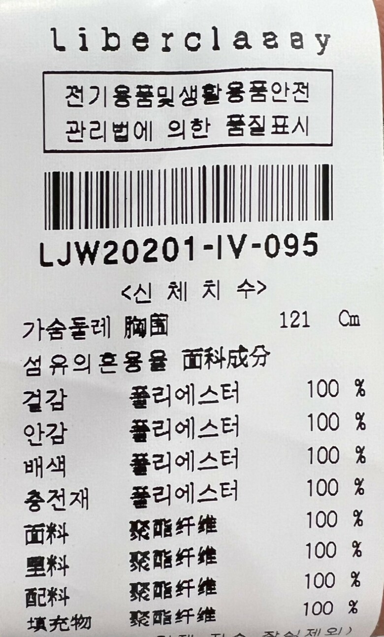| 1. 제품 소재 (섬유의 조성 또는 혼용률을 백분율로 표시, 기능성인 경우 성적서 또는 허가서) | 겉감:폴리에스테르 42%, 면 58% / 안감:폴리에스테르 100% / 배색1: |