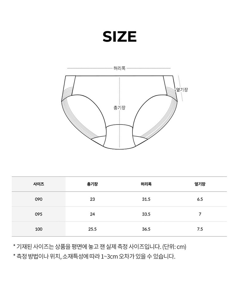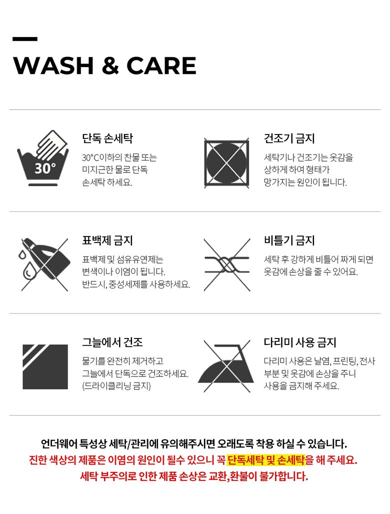 | 6. 세탁방법 및 취급시 주의사항 | 농색은 절대 분리 세탁하시고, 속옷은 반드시 손세탁 해주세요. (세탁기 사용시 세탁망에 넣어서 손세탁 기능으로 세탁, 건조기사용금지) |
